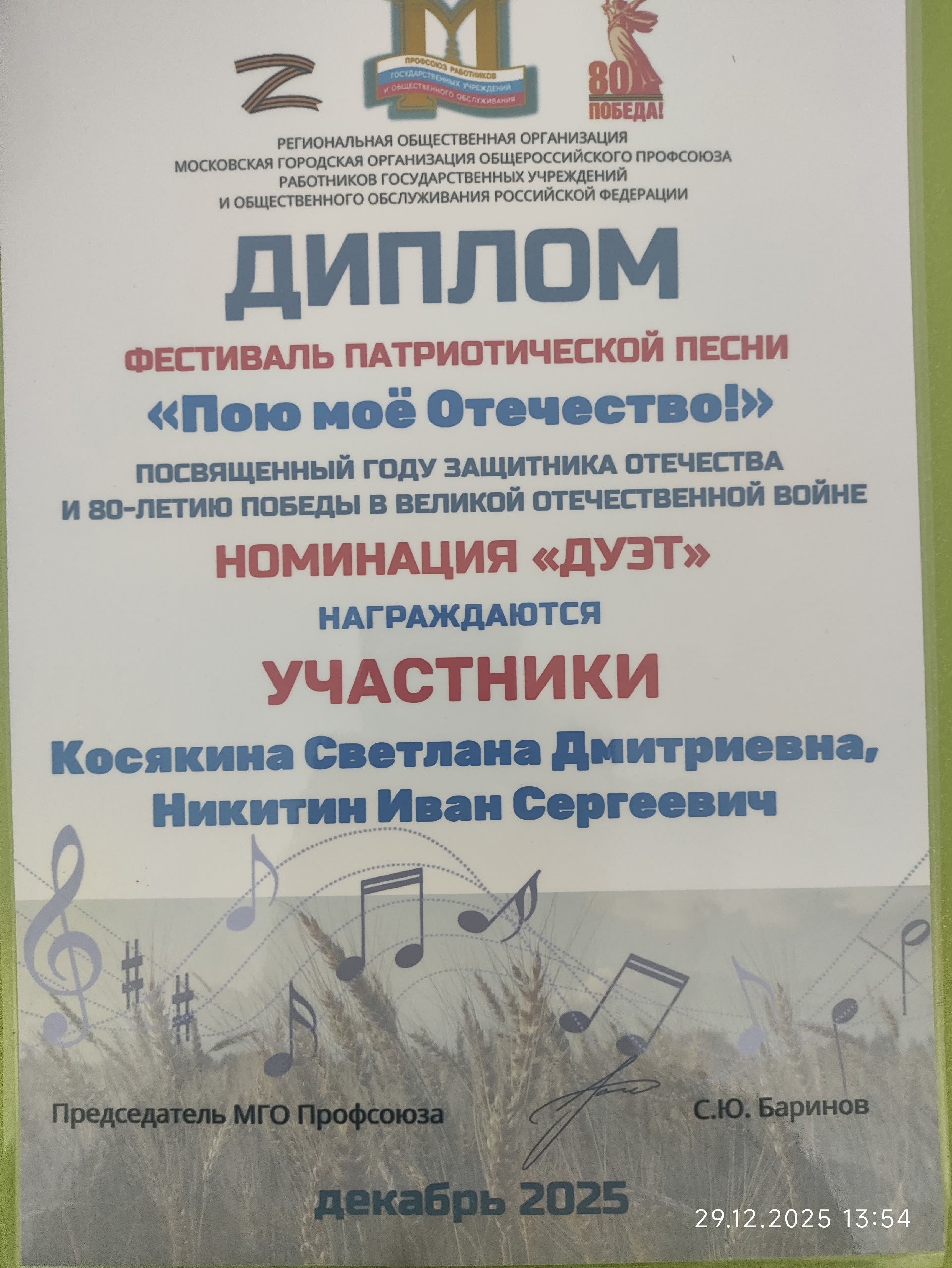 Диплом Фестиваль патриотической песни "Пою моё Отечество" посвященный году защитника Отечества и 80-летию победы в Великой Отечественной Войне